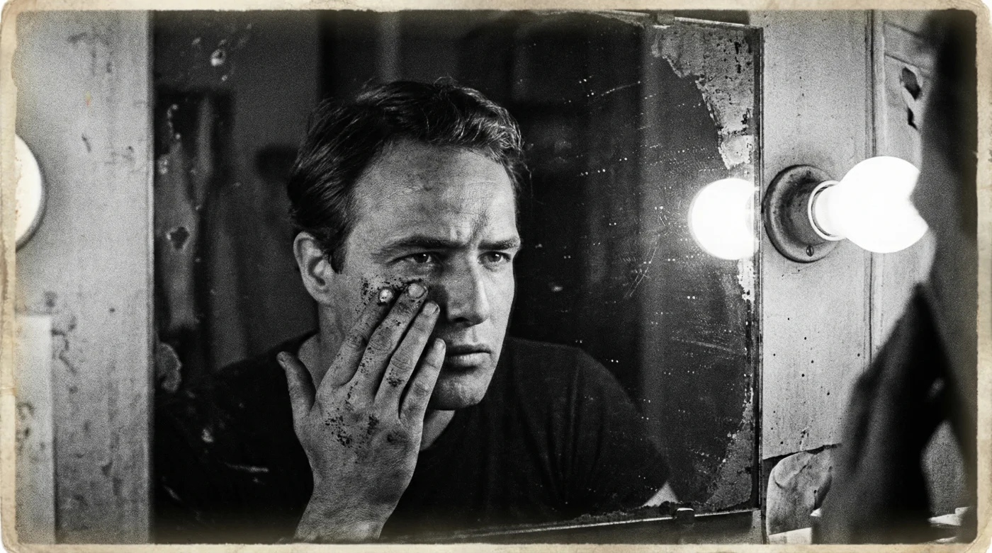 Poi, in questo clima saturo e sintetico, entra qualcuno che porta con sé un aroma completamente diverso e inaspettato. Un profumo terroso, amaro, familiare e vibrante che taglia di netto l’odore chimico e stantio della stanza del trucco. È Marlon Brando, giovane, irrequieto e con nessuna intenzione di sedersi su quella sedia per farsi cancellare l’anima sotto uno strato di pigmento opaco color pesca. La sua è una presenza che esige spazio e verità, rigettando le convenzioni rassicuranti di un’epoca che preferiva la finzione assoluta.