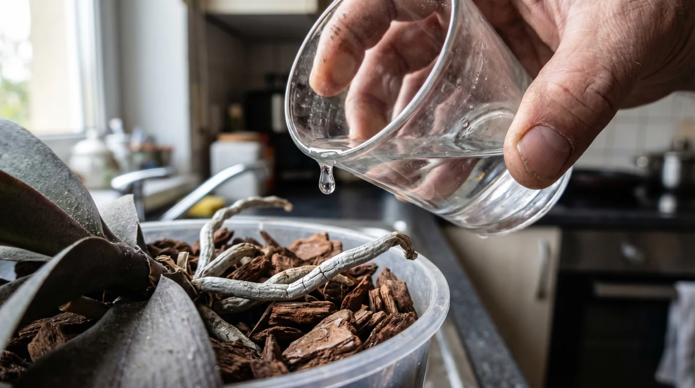Per l’osservatore del vaso trasparente, il vantaggio è tutto visivo. Il tuo segnale d’azione non è mai dettato dal calendario settimanale, ma dal colore. Solo quando le radici diventano grigio argento, è il momento di agire. Versa il tuo mezzo bicchiere lentamente lungo i bordi interni del vaso di plastica. Il bark si inumidirà a chiazze, spingendo le radici ad allungarsi per cercare quell’umidità, rafforzando così l’intera struttura della pianta.
