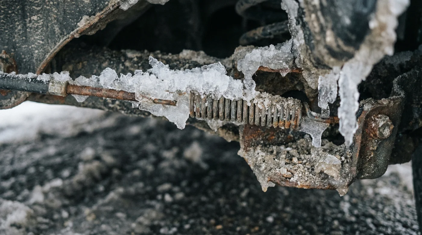 Ma la fisica del crudo inverno non perdona le abitudini non ragionate. Quando la colonnina di mercurio scende sotto lo zero termico, l’umidità della notte e il fango sollevato durante la guida si insinuano nelle sottili guaine protettive sotto il pianale della tua vettura. L’acqua si espande trasformandosi in ghiaccio, stringendo i cavi metallici in una morsa letale. Le ganasce o le pastiglie rimangono serrate contro i dischi, ignorando totalmente il comando della leva che hai appena abbassato nell’abitacolo.
