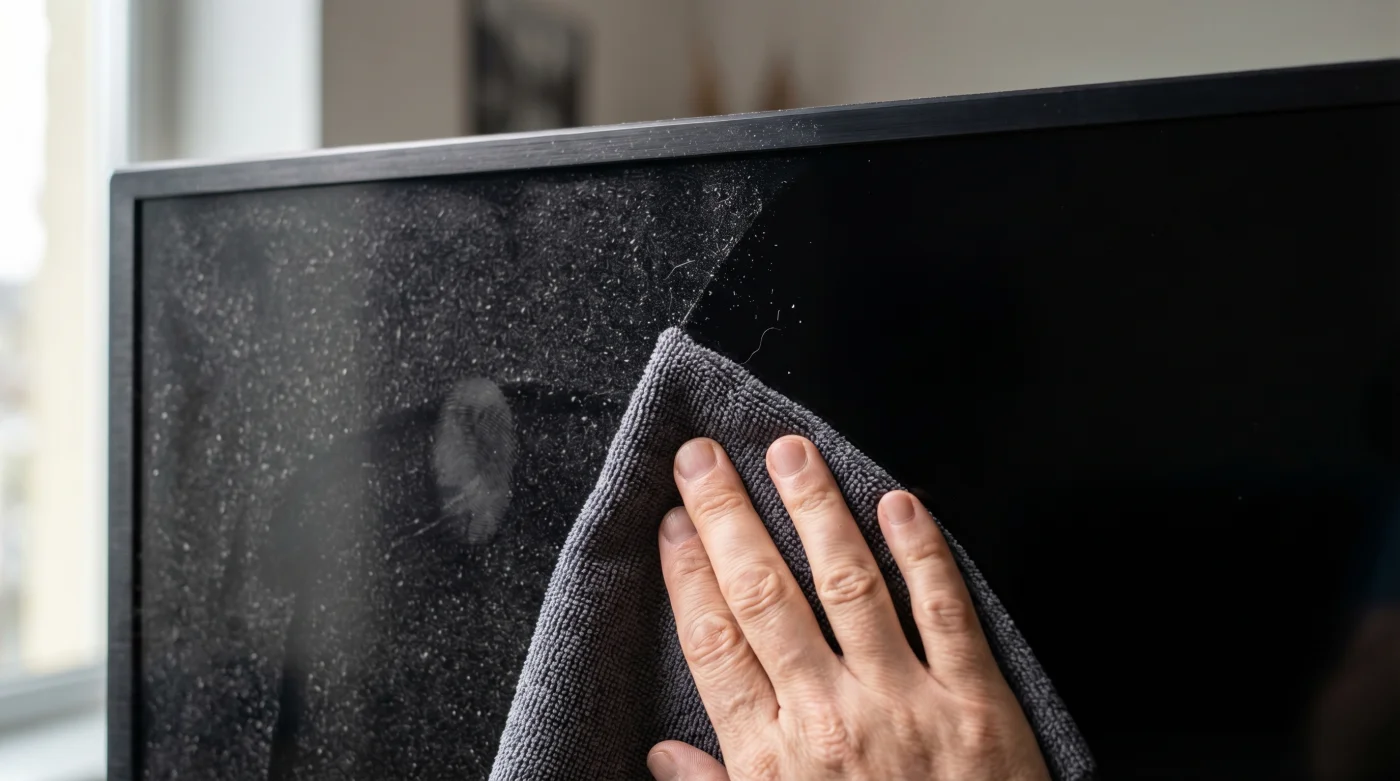 La preparazione è essenziale per il successo di questa tecnica. Prima di iniziare, devi necessariamente spegnere il televisore e lasciarlo raffreddare per almeno quindici minuti. Un pannello caldo crea microscopiche correnti convettive che attirano la polvere e rende i leggeri strati di sebo delle impronte digitali molto più difficili da catturare a secco. Inoltre, la tela completamente nera di uno schermo spento è l’unica condizione che ti permette di vedere esattamente le zone su cui devi intervenire.