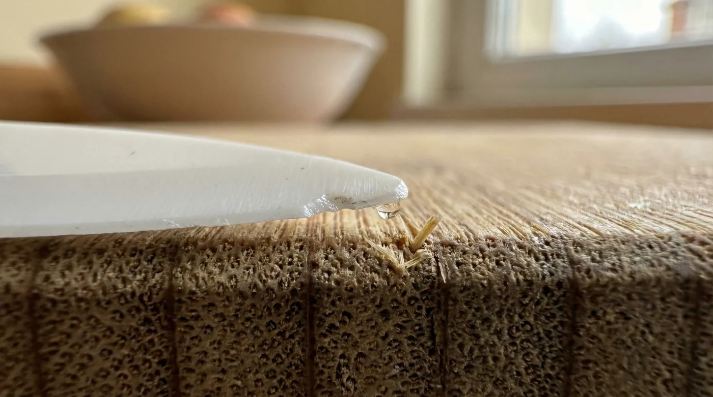 Se vuoi continuare a usare il tuo set di coltelli in ceramica direttamente sul bambù, esiste un intervento fisico. Una modifica tattile rapida alla superficie della tua tavola che altera la sua tensione superficiale, rendendola temporaneamente molto più clemente verso le lame fragili. Si tratta di saturare le fibre esterne idratandole a caldo.