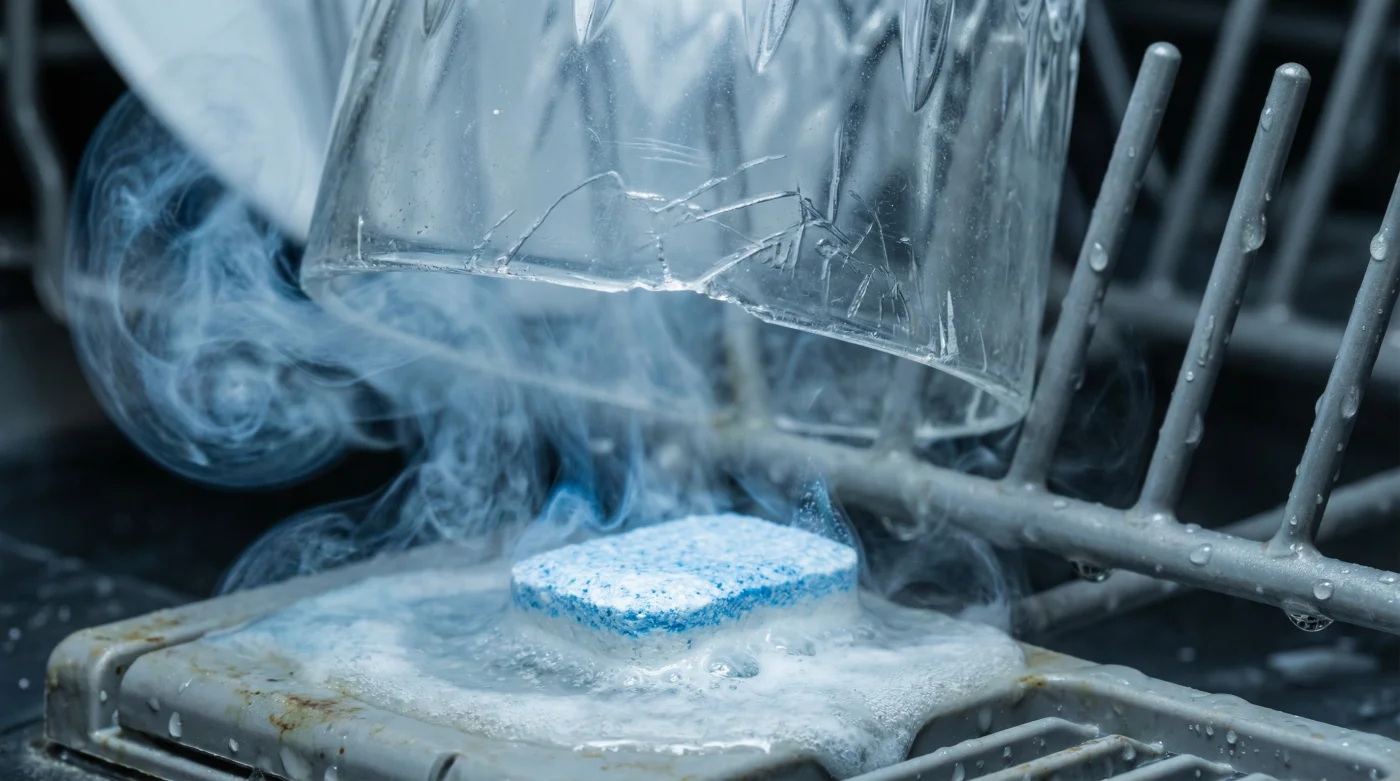 Quando la pastiglia cade sul fondo o tra le forchette, si scioglie istantaneamente durante la primissima fase di ammollo o prelavaggio. Questo crea **un rilascio chimico iper-concentrato iniziale** in un momento in cui l’acqua è ancora scarsa e fredda. Il detergente, denso e aggressivo, si aggrappa alle pareti delicate dei bicchieri.