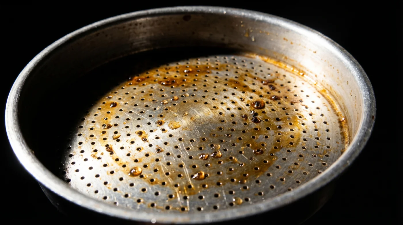 La soluzione reale richiede precisione chirurgica. Per i puristi del weekend, basta utilizzare un semplice ago da cucito per liberare fisicamente ogni singolo foro ostruito, mantenendo assolutamente intatta l’oleosità generale della parete metallica. Se avete i minuti contati al mattino prima di percorrere i vostri soliti 20 km per andare al lavoro, un compromesso accettabile è l’immersione rapida del solo filtro in acqua bollente non salata per un minuto esatto, che ammorbidisce l’eccesso senza sciogliere la protezione di base.